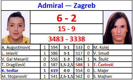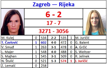 Završili smo s ligaškim utakmicama za ovu kalendarsku godinu pobjedom protiv Rijeke 6-2. Čunjevi su već od prvog seta bili na našoj strani do konačnih +215 prednosti, a poene su nam uspjele oduzeti sestre Juričić, po jedna u svakom bloku. Tihana je nastavila svoj niz odličnih rezultata sa 602!